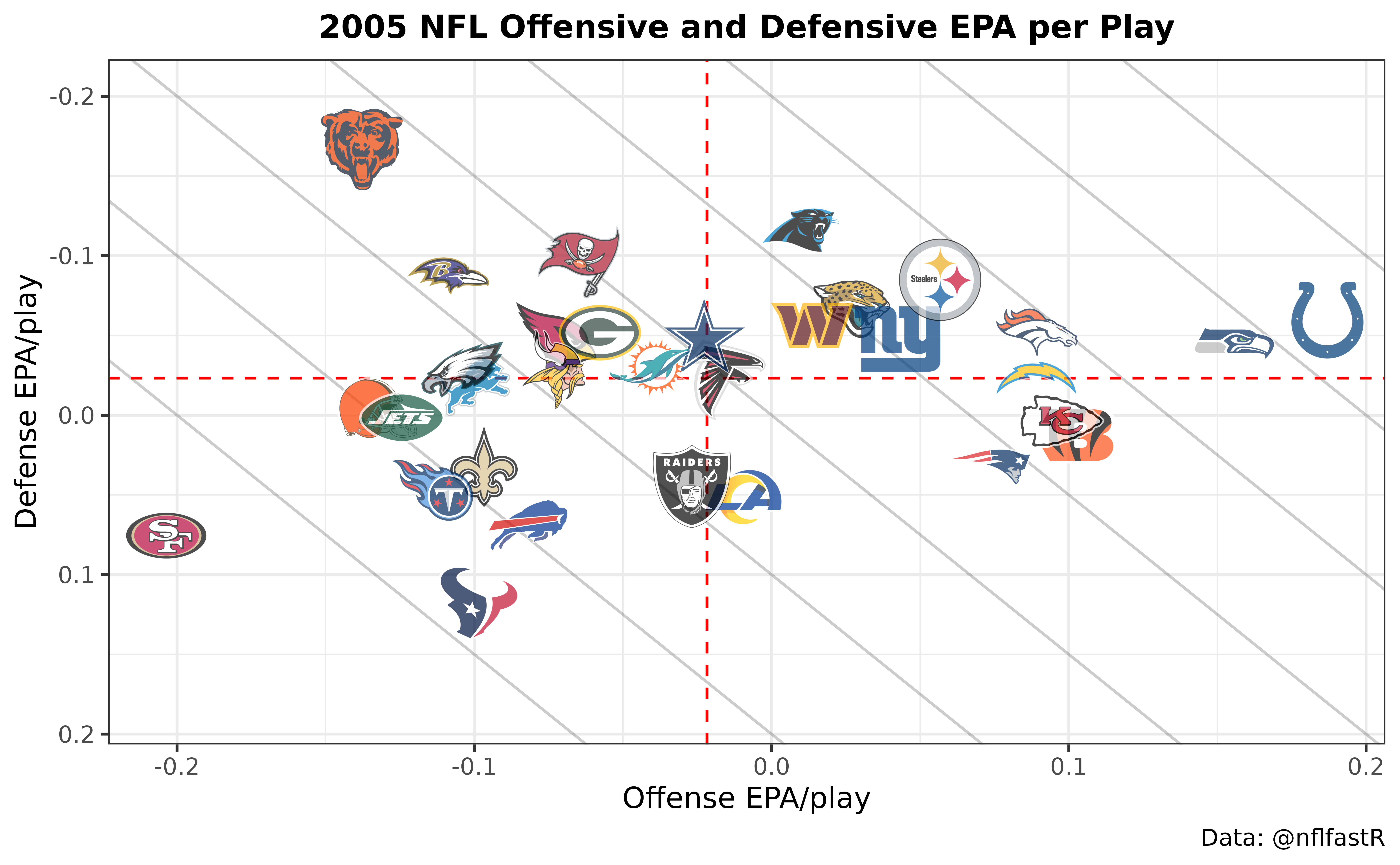 #> F-statistic: 106.2 on 1 and 542 DF, p-value: < 0.00000000000000022So R2 is somewhat higher for just point differential. This isn’t surprising as we’ve thrown away special teams plays and haven’t attempted to make any adjustments for things like fumble luck that we know can improve EPA’s predictive power.